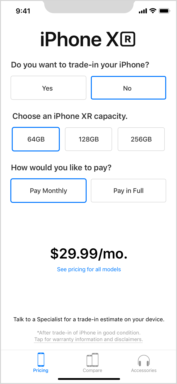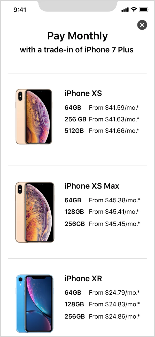 Leverage the lowest pricing option to attract prospective iPhone customers to purchase and existing iPhone owners to upgrade. To do so, display the monthly pricing amount for customers trading in an iPhone 7.